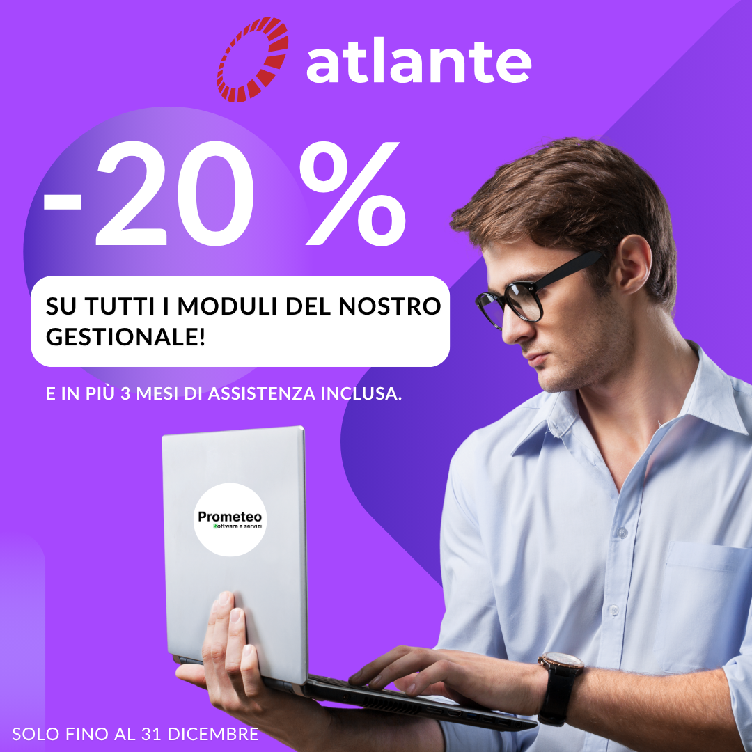 Fino al 31 dicembre, tutti i moduli del gestionale Atlante sono scontati del 20 %, e in più avrai 3 mesi di assistenza tecnica gratuita per partire senza pensieri.